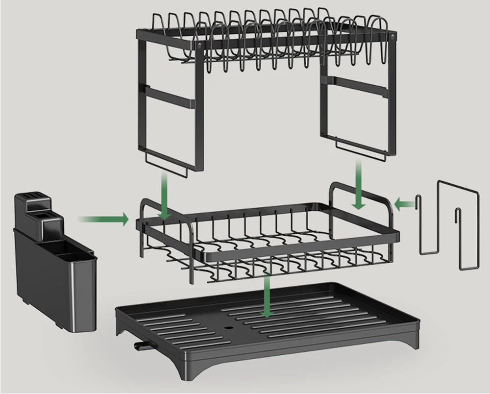 Avec ses dimensions compactes de 42 × 30 × 29 cm, cet égouttoir est idéal pour les petites cuisines. Sa conception à deux niveaux offre suffisamment d'espace pour ranger assiettes, bols, tasses, ustensiles et planches à découper sans encombrer le plan de travail.